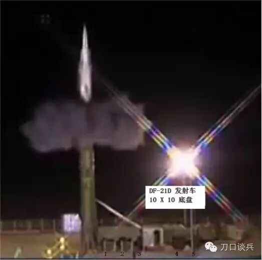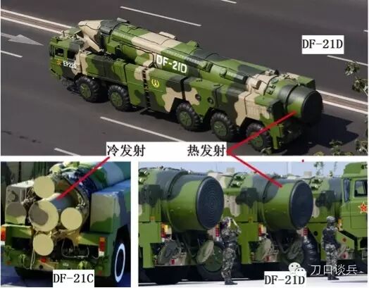 对比DF-21C和DF-21D的图片,两型发射筒底部明显不同,显然C型是冷发射,D型是热发射,这也符合上述视频中,DF-21的导弹还未完全离开发射筒就看到火焰,而冷发射是导弹离开弹筒后一段距离,发动机才点火。采用热发射可以使DF-21D进行全疆域的无依托发射,还可以增加导弹的长度(弹头更长)。