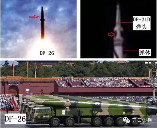 那它会不会是DF-26呢?看下面拼图,DF-26不仅是载车多了一对轮(12X12),而且弹头与弹体的直径比、以及弹头上的弹翼位置也完全不同。(见下图)