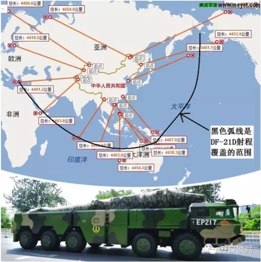 由于采用世界上最先进的N15高能固体燃料,DF-21D的射程达4500KM,福州与关岛的距离是3630KM,下图的黑色弧线是DF-21D在西太平洋和印度洋的威慑范围。