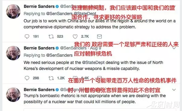 另一边,自由派参议员、曾经的总统候选人伯尼桑德斯呢,可以说是旗帜鲜明地反对特朗普了。他连发三条推特,就朝鲜问题质疑特朗普的能力。说起来,这名议员还是一位民主社会主义者,也是美国历史上第一名信奉社会主义的参议员,因此,他在推特上也是一直强调美国应该跟中国合作。