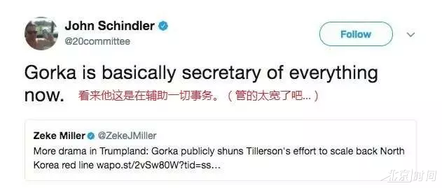 但蒂勒森估计做梦也没想到,人在家中坐,锅从天上来,自己的一番言论竟然招致了白宫总统副助理塞巴斯蒂安·戈克的炮轰。《华盛顿邮报》用了一个非常具有戏剧性的标题:《特朗普帝国又添新戏:戈克公开否认蒂勒森在解决朝鲜问题上的努力》(MoreDrama in Trumpland: Gorka Publicly Shuns Tillerson’s Effort toScale Back North Korea RedLine.) 戈克呢,则毫不留情面地说蒂勒森做的事情都是无意义的(nonsensical)。