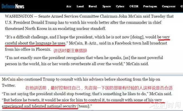 相比之下,不久前曾爆出美国海军在中国南海境内消失的DefenseNews,态度就比较严肃了。在为数不多的关于对朝制裁话题的一条新闻中,援引了曾参加越南战争、现任亚利桑那州资深联邦参议员McCain的话,不出意料,还是在吐槽特朗普不会讲话:"在他讲话前,最好能控制一下自己,先咨询一下国防部里有经验的人。"